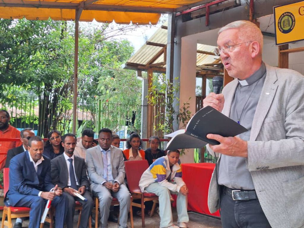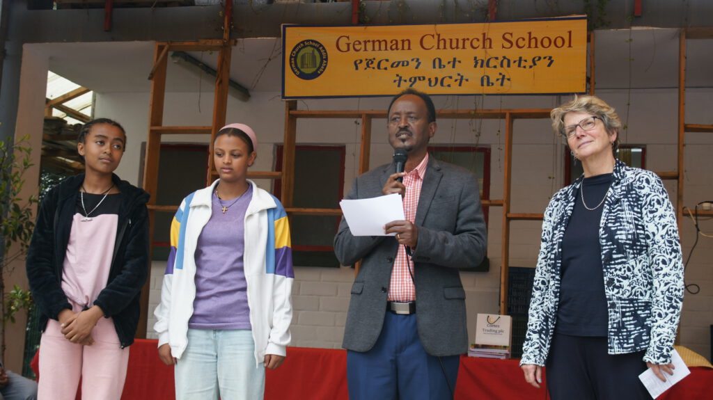 Auch Pastor Dr. Jürgen Klein übermittelte Grußworte und gab bekannt, dass die Deutschsprachige Evangelische Kirche in Äthiopien (German Speaking Evangelical Church in Ethiopia) ihre Registrierungsurkunde erhalten hat, die sie zu einer legalen Körperschaft macht. Er erklärte, dies sei nach jahrelangen, intensiven Bemühungen „gemeinsam durch den Glauben erreicht worden“. In seiner Andacht bezog er sich auf Markus 9,23: „Alle Dinge sind möglich dem, der da glaubt.“ Er beglückwünschte die Erstklässler – knapp über 30 an der Zahl – und ihre Eltern, die sich freuen, dass ihre Kinder an der German Church School lernen können.