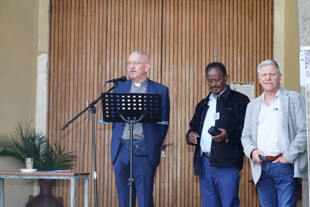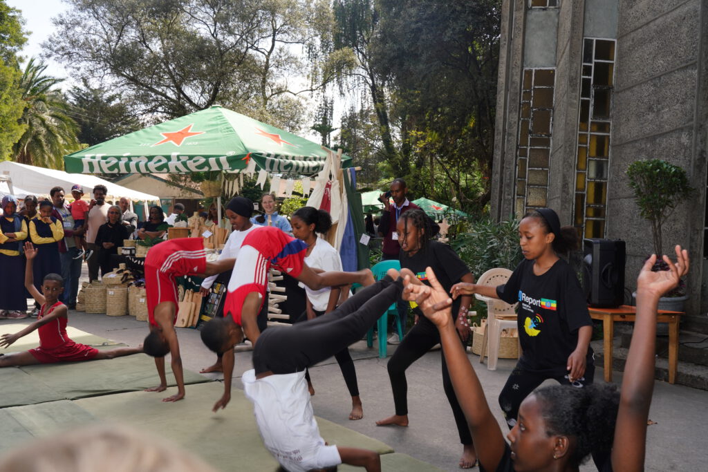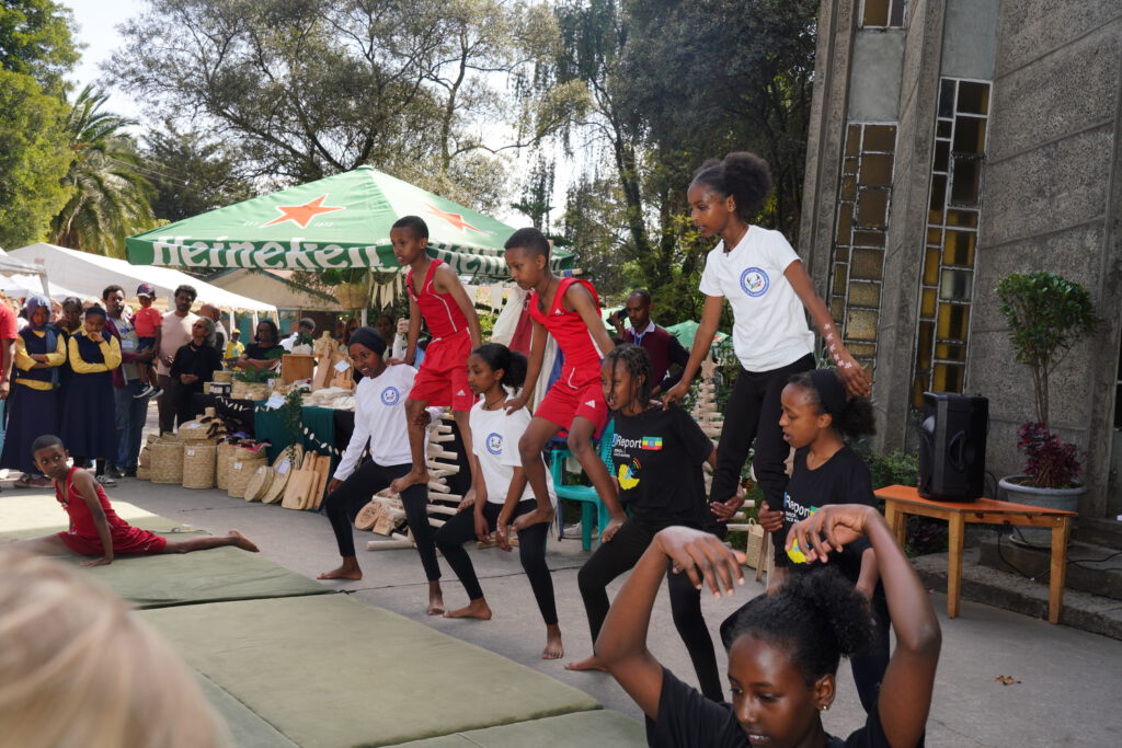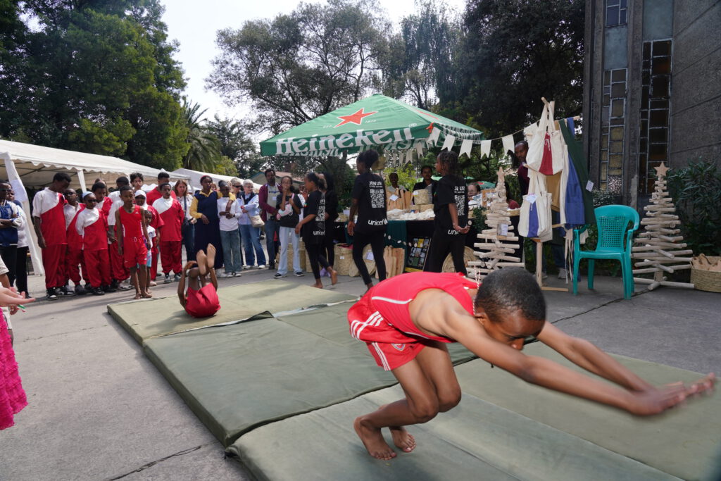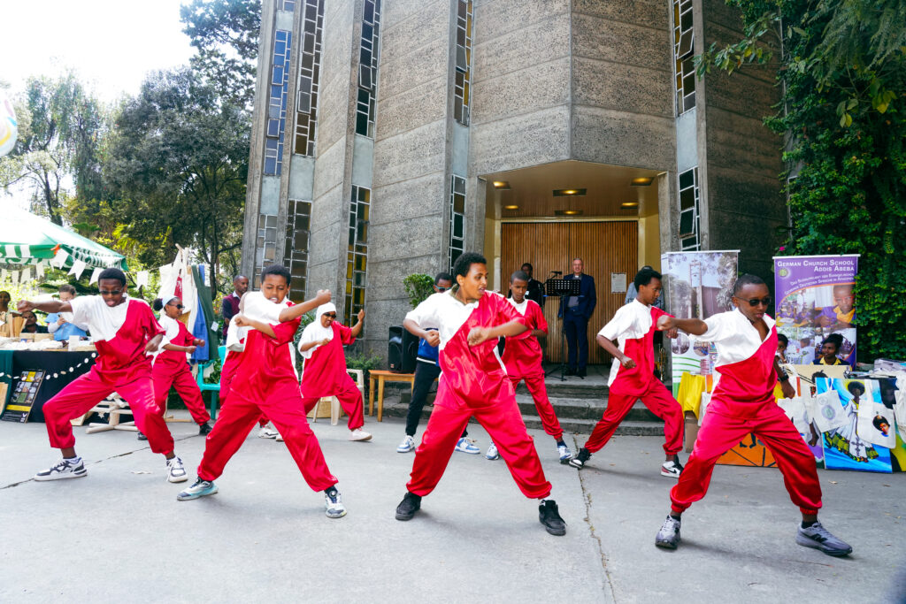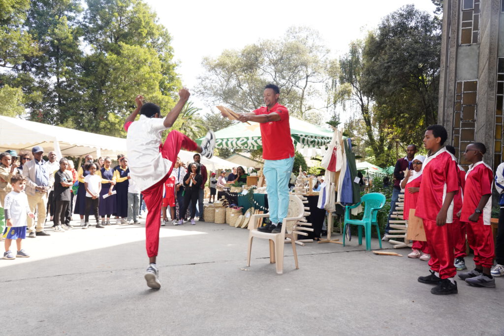 Zu Beginn um 10 Uhr gab es eine Aufführung der Addis Abeba Gymnastics Federation (Turnverband), die ja unsere Nachbarn sind, und für die vor über 20 Jahren eine Sporthalle mit unserer und mit Hilfe der Deutschen Botschaft gebaut wurde. Vor Kurzem haben wir die Kooperationsvereinbarung erneuert, denn wir dürfen nicht nur die Sporthalle, sondern auch einen grünen, ca. 10-12 Meter breiten Grünstreifen ihres Landes entlang unsere östlichen Mauer benutzen. Zudem wurde Pastor Dr. Jürgen Klein bei dieser Gelegenheit zum Schirmherr des Turnverbands ernannt, was für Kirche & Schule eine große Ehrung bedeutet. Es folgte eine Karateshow der Kinder der German Church School, die erneut das große Selbstvertrauen zeigte, welches gerade unsere blinden und körperlich eingeschränkten Kinder an unserer Schule finden. Nach der Begrüßung durch Pastor Klein sprach der amtierende Chargè d’Affairs der Deutschen Botschaft, Dr. Ferdinand von Weyhe als Schirmherr des Basars, sowie unser Schulleiter Ato Teklu Tafesse.