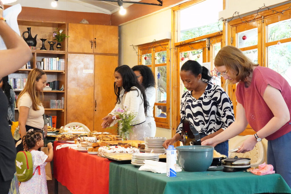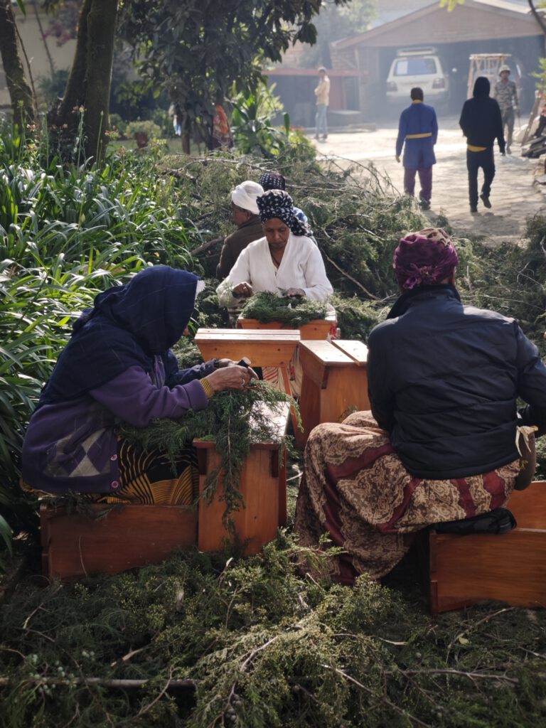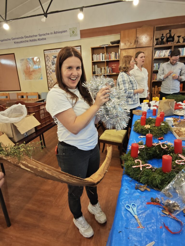 Es wurden ca. 90 Adventskränze verkauft, deren Rohmaterial vom Jan-Meda-Feld von äthiopischen Frauen einer Organisation für Holzträgerinnen gebunden und von Frauen aus der Kirchengemeinde dekoriert wurden. In der Parish Hall wurden Adventskalender und Weihnachtsleckereien aller Art verkauft, die zuvor von Einigen aus unserer Gemeinde aus Deutschland mitgebracht wurden. Außerdem gab es wieder jede Menge Kuchen und Salate, sowie an zwei Grillständen Bratwürste, Habesha-Essen und Kaffee, daneben Bier und Glühwein, die insgesamt wieder viele Einnahmen generierten.